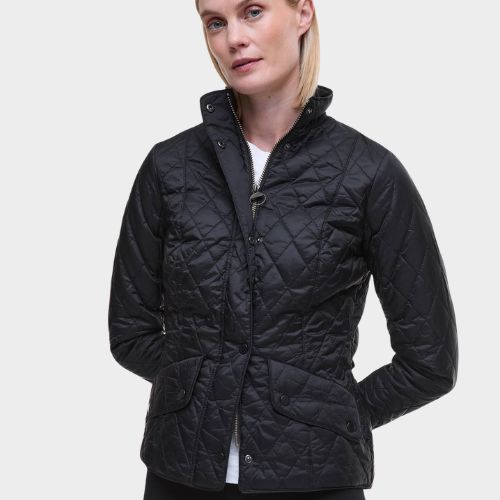 The Barbour Flyweight Cavalry Quilted Jacket is a diamond-quilted design with a flattering curved back hem and angled pocket flaps. Styled with a funnel collar, it offers a classic fit and features a studded and elasticated back belt for a smart finish with unrestricted movement.