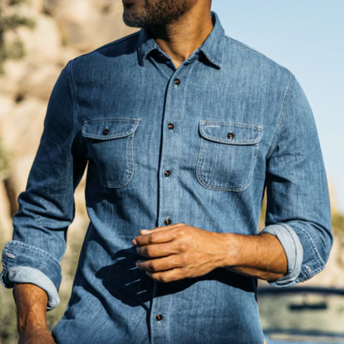 Classic fit. 100% cotton 7oz denim fabric, triple stitched shoulders, back and side seams, bar tacked reinforced pockets, pen pocket, cat eye buttons, chainstitch run-off on side seams. Made in USA.