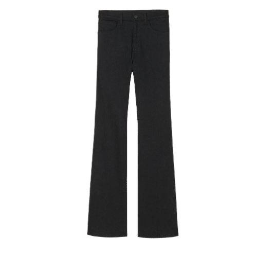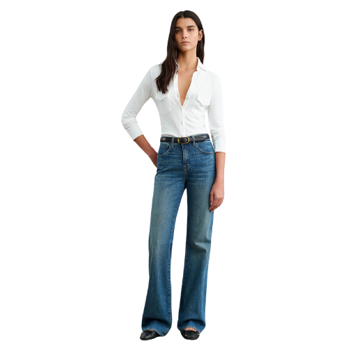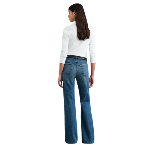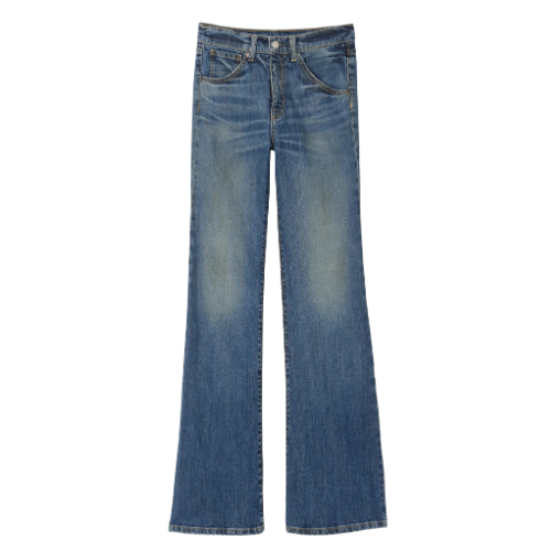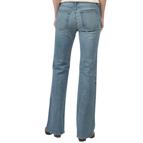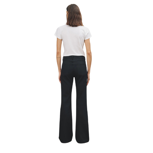 Mid-rise flare leg jean in Japanese stretch denim. Five pocket details. Zip fly. Shank closure. Belt loops.
