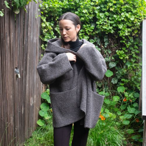 SOFTLY FELTED/ DOUBLE FACE KNIT / OVERSIZE PATCH POCKETS/ DEEP SHAWL COLLAR / MADE IN PERU