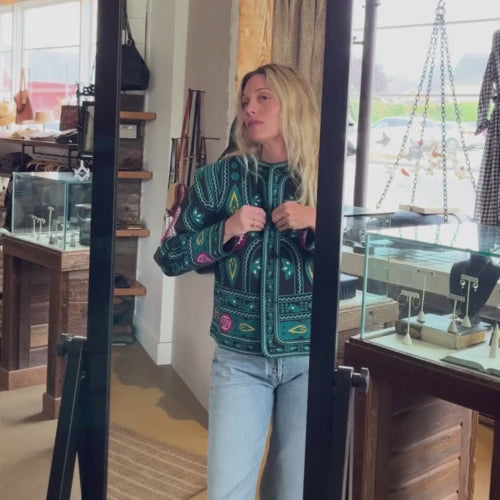 The Gael applique cotton jacket features a bold multi colored applique throughout and extended shoulder silhouette.