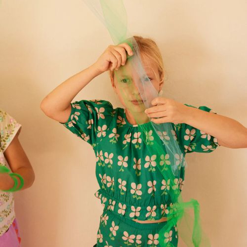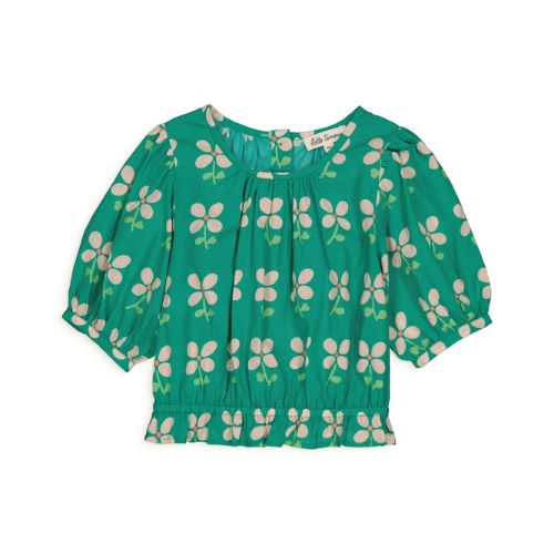 Short blouse in all-over printed cotton voile with flounce at waist. Puffed sleeves above the elbow. Round collar and button back.