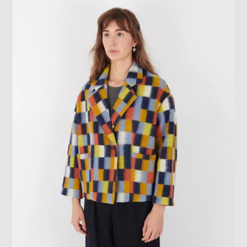 A statement piece in multicolour felted wool, patterned in painterly square blocks. Designed with a structured blazer collar, front patch pocket, and cropped sleeves for a fashion-forward silhouette.