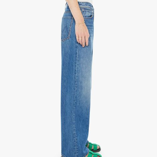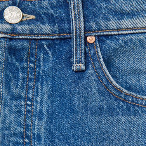 Jeans designed to sit on the hips with a slouchy fit, a loose straight leg, button fly and a 28.5-inch inseam with a clean hem. Made from rigid SUPERIOR denim, Green Thumb is a classic blue with whiskering and fading at the knees.