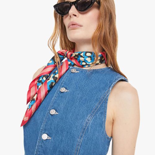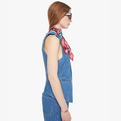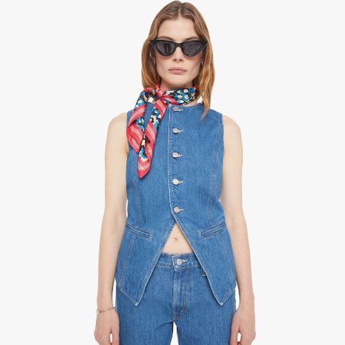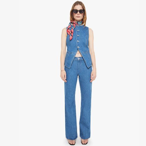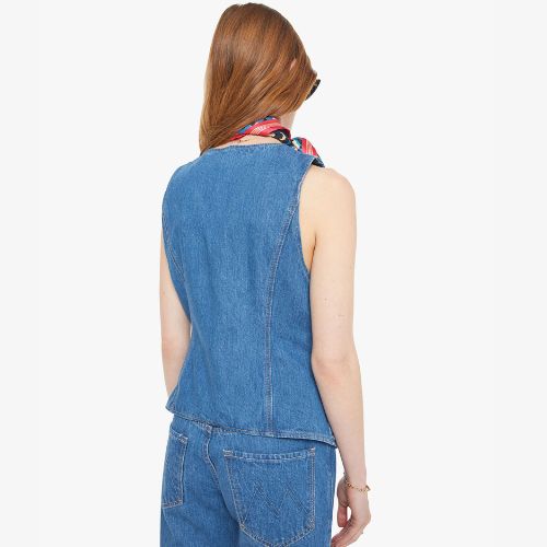 All roads lead here. A denim vest with a crewneck, buttons down the front, slit pockets and angled seams. Made from rigid SUPERIOR denim, Scoot This Way is a mid-blue with subtle fading and silver hardware.