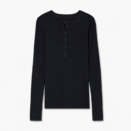 Slim rib long sleeve henley tee in cotton. Five center front buttons. Neck and placket finished with self trim.