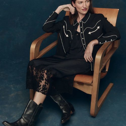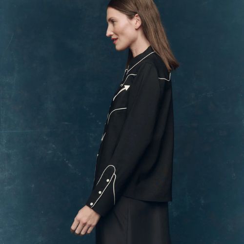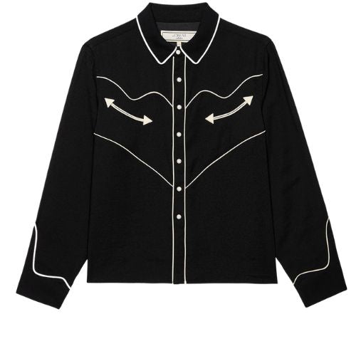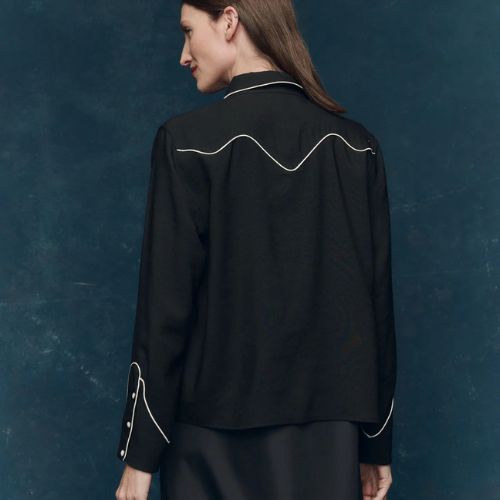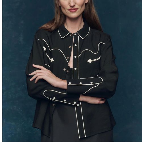 Rooted in classic rodeo style and reimagined with feminine charm, The Western Shirt is our ode to the iconic silhouettes of the American West. Cut from a sleek, drapey rayon twill, it moves with ease and carries just the right amount of shine. The details make it special—think curved western yoke, piped seaming, tall cuffs, and authentic pearl snaps that lend a vintage authenticity. The boxy fit and tapered cuffs create a flattering shape, while the tailored collar brings a polished touch. A timeless staple with storytelling stitched into every seam—pair it with denim for an effortlessly cool look that rides between rugged and refined.