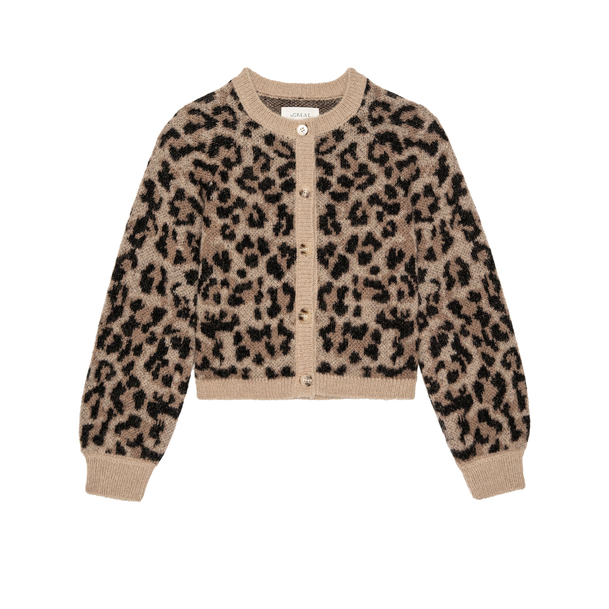 Classic with a twist, this cropped cardigan is spun from a lofty alpaca blend and knit with a bold leopard jacquard in a playfully oversized scale this versatile sweater is finished with blouson sleeves and light horn buttons.