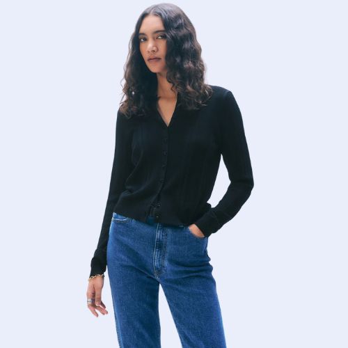A transitional sweater with a feminine detail. Spun from 100% merino wool, this slim-fitting cardigan features ribbed texture and covered buttons.